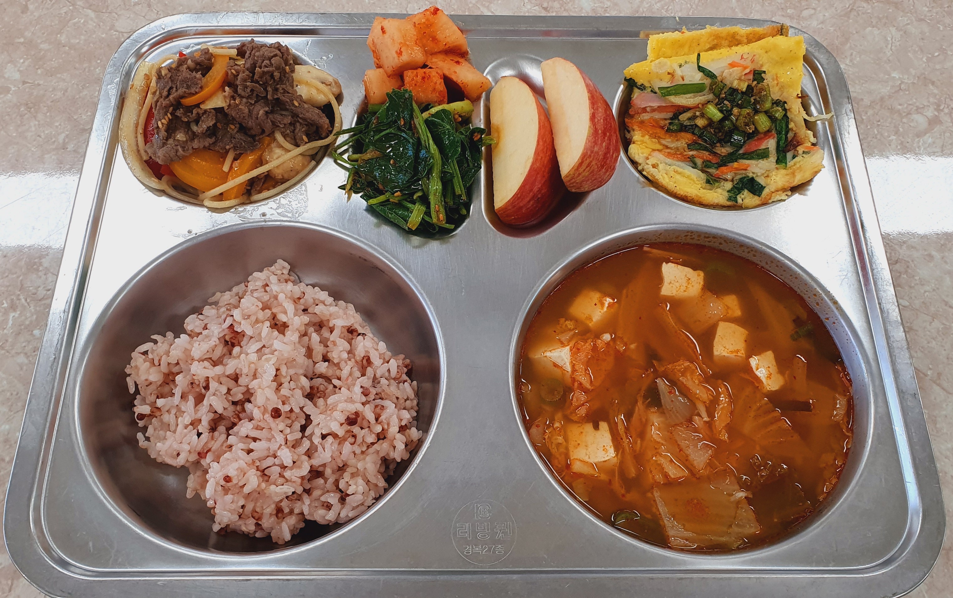 3/20 차수수밥/참치김치찌개(5.9)/불고기파스타(5.6.16)/팽이버섯맛살전(1.5)/방풍미나리나물(5)/깍두기(9)/사과