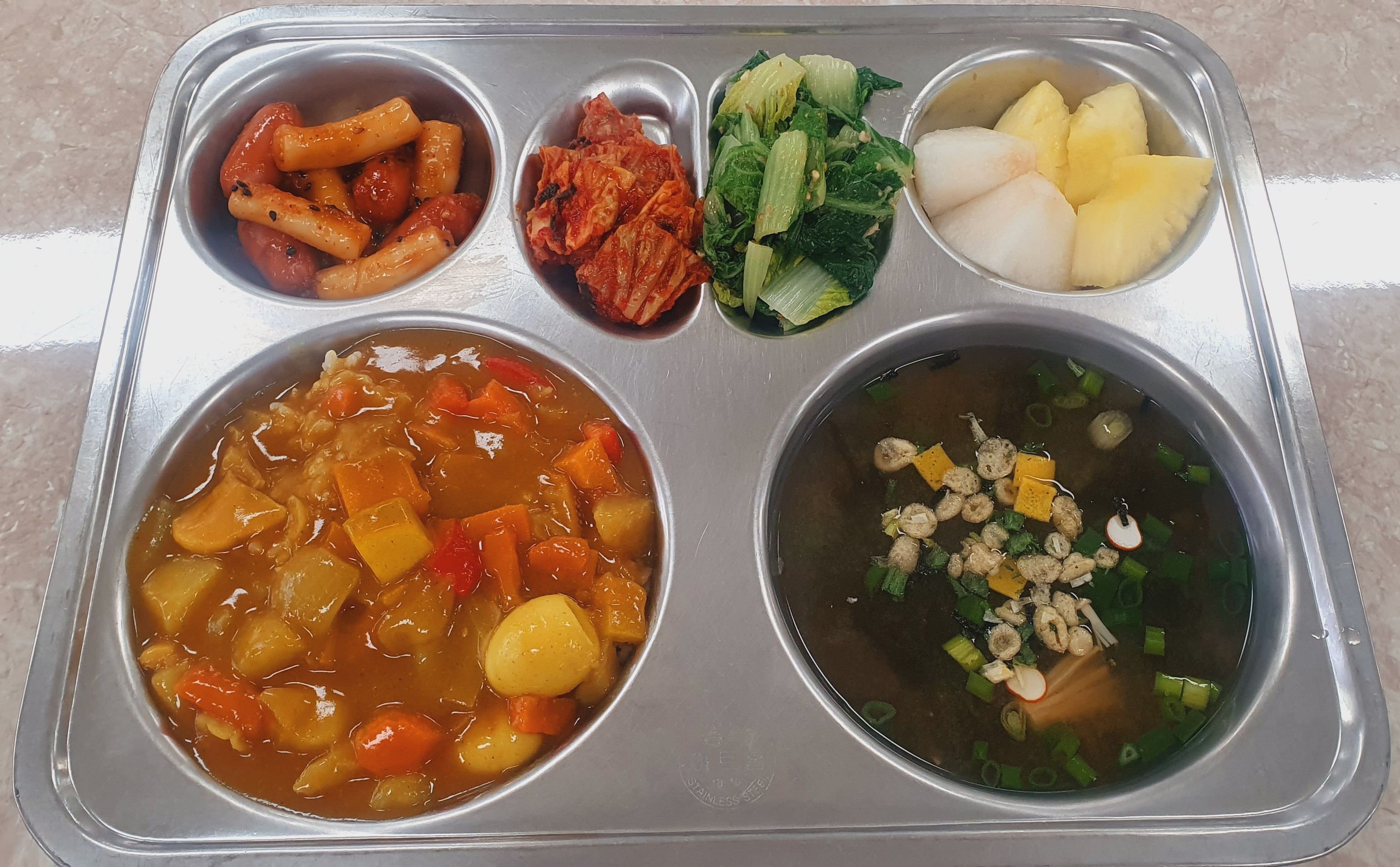 3/25 카레라이스(1.6.17)/가다랑어장국(6.9)/꼬치없는소떡(5.6.10.12)/단배추된장무침(5)/배추김치(9)/모듬과일