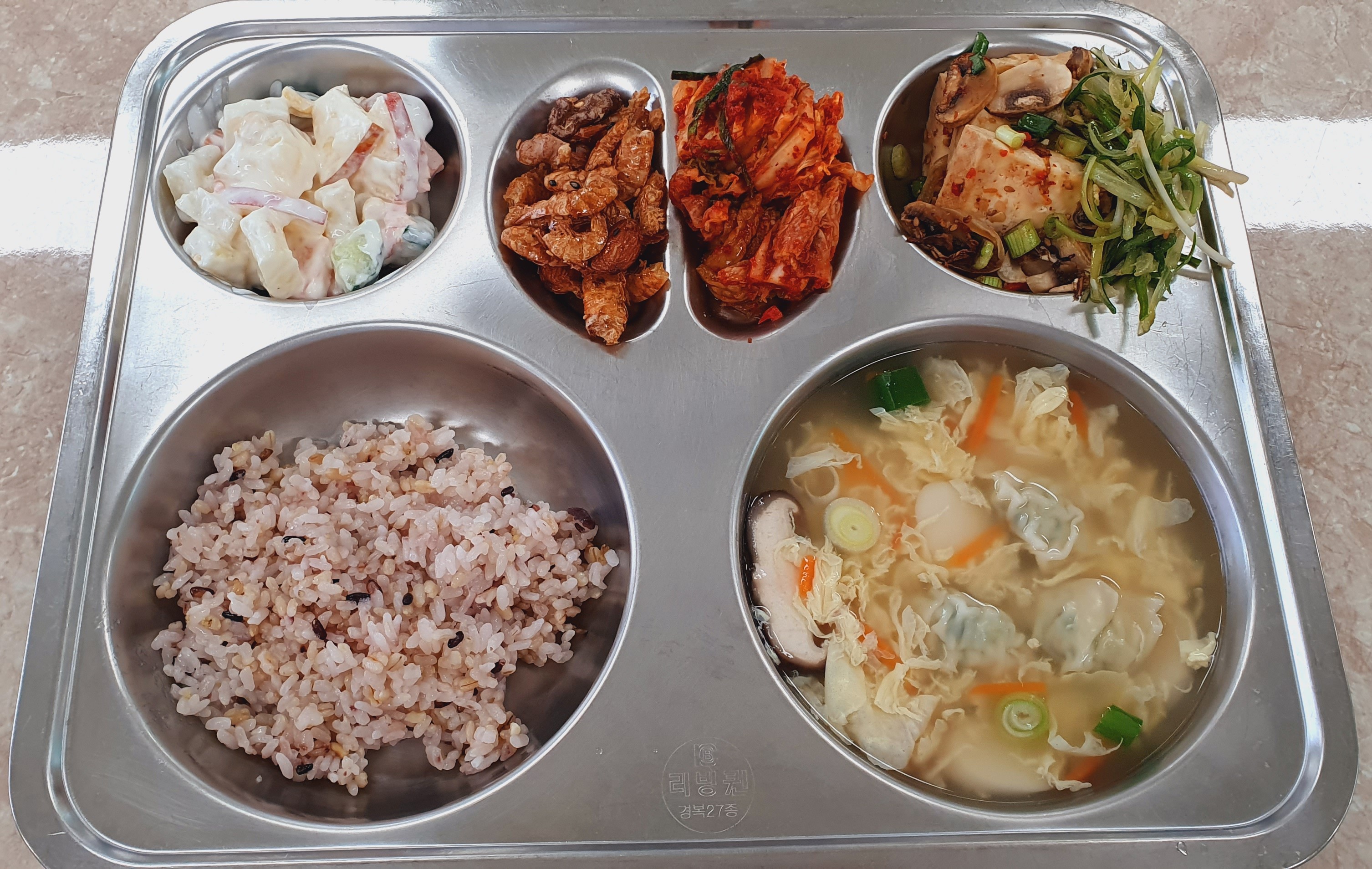 3/26 혼합잡곡밥/떡만두국(1.5.6.9.10)/두부양념구이(5)&파채겉절이(5)/사과감자사라다(1.5)/건새우견과류볶음(5.9.14)/배추김치(9)