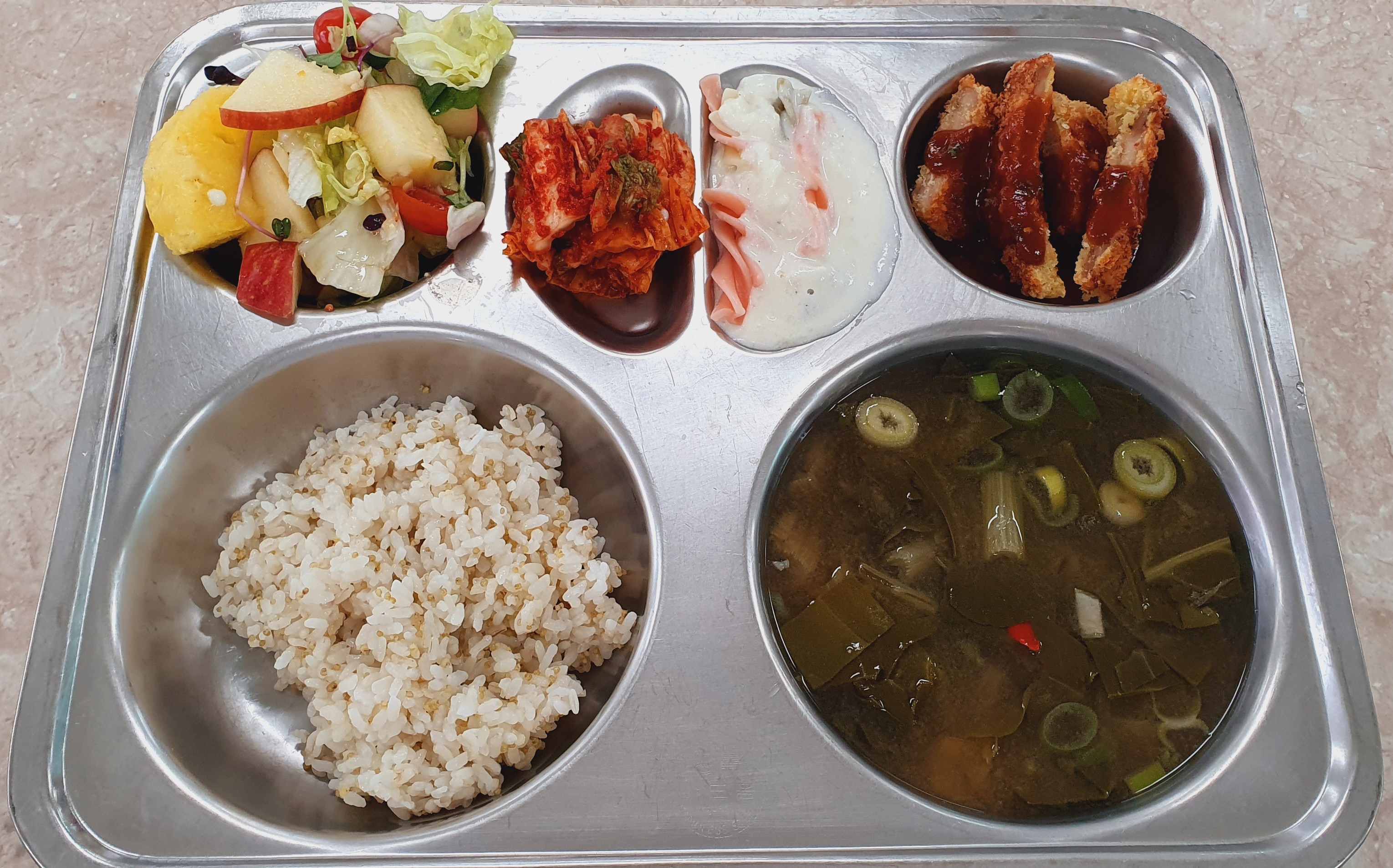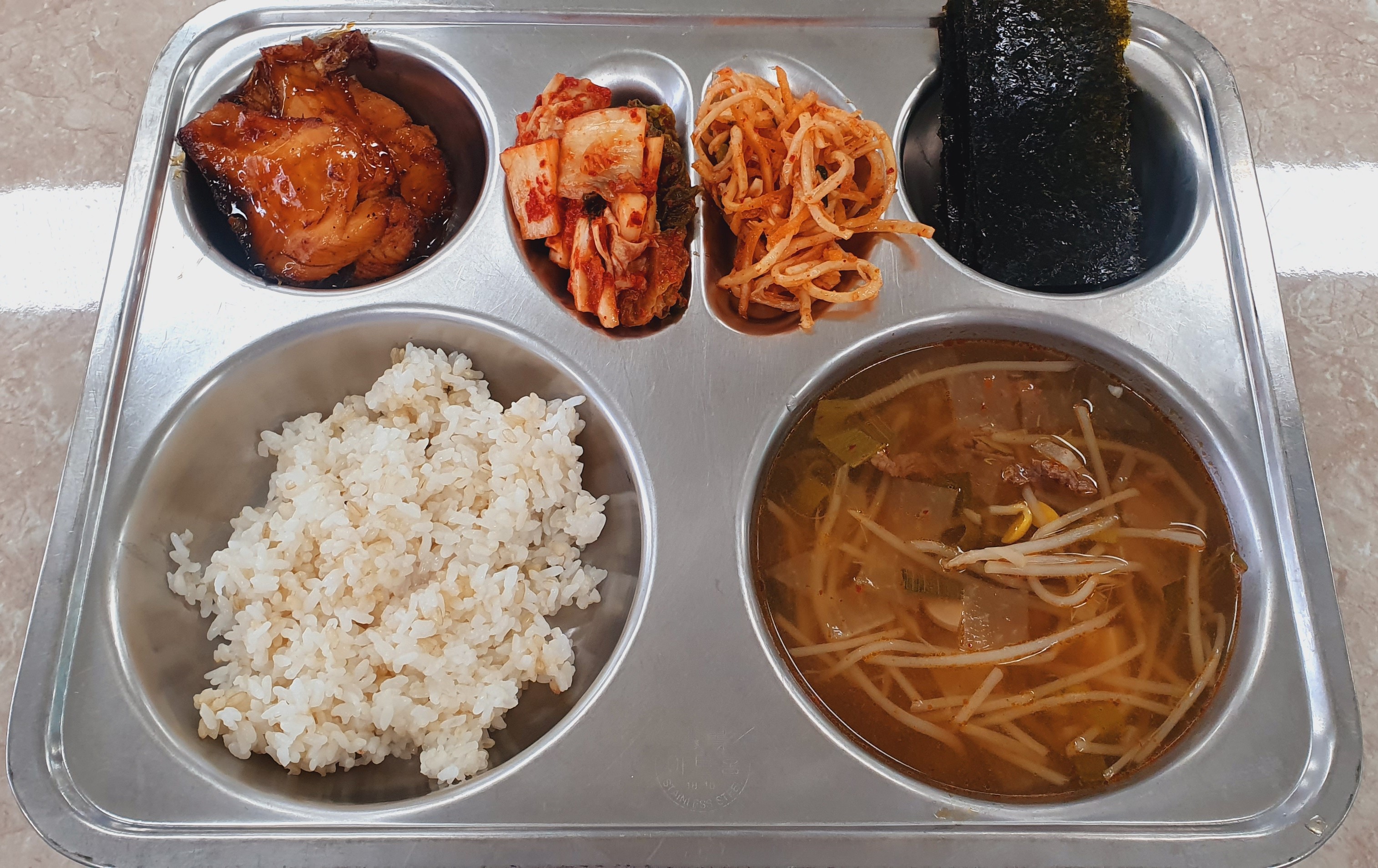 3/24 찰현미밥/쇠고기국(5.16)/연어데리야끼구이(5.6)/진미도라지무침(5.17)/배추김치(9)/수제김구이
