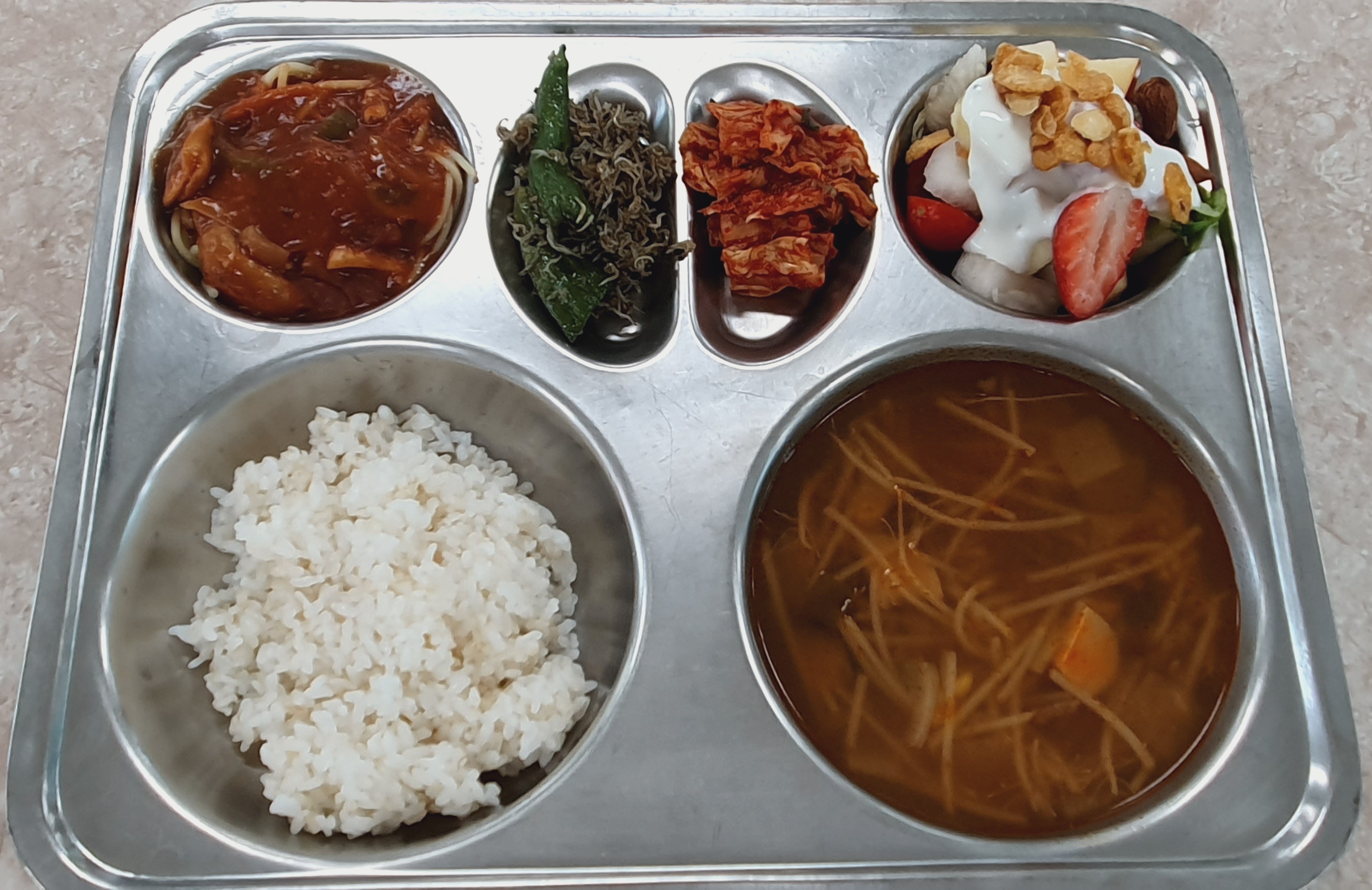 4/16 찰현미밥/쇠고기국(5.16)/토마토스파게티(5.6.9.12.17)/과일야채샐러드(1.2.5.12)/멸치꽈리볶음(5)/배추김치(9)