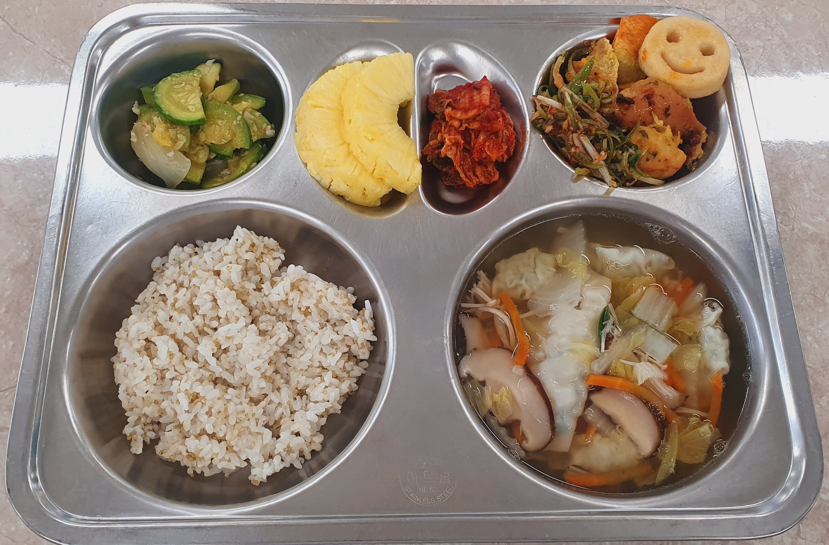 4/17 차조밥/만두전골(5.6.9.10)/탄두리치킨(2.5.6.12.13./15.16.18)/파채무침(5)/애호박나물(5.9)/배추김치(9)/골드파인애플