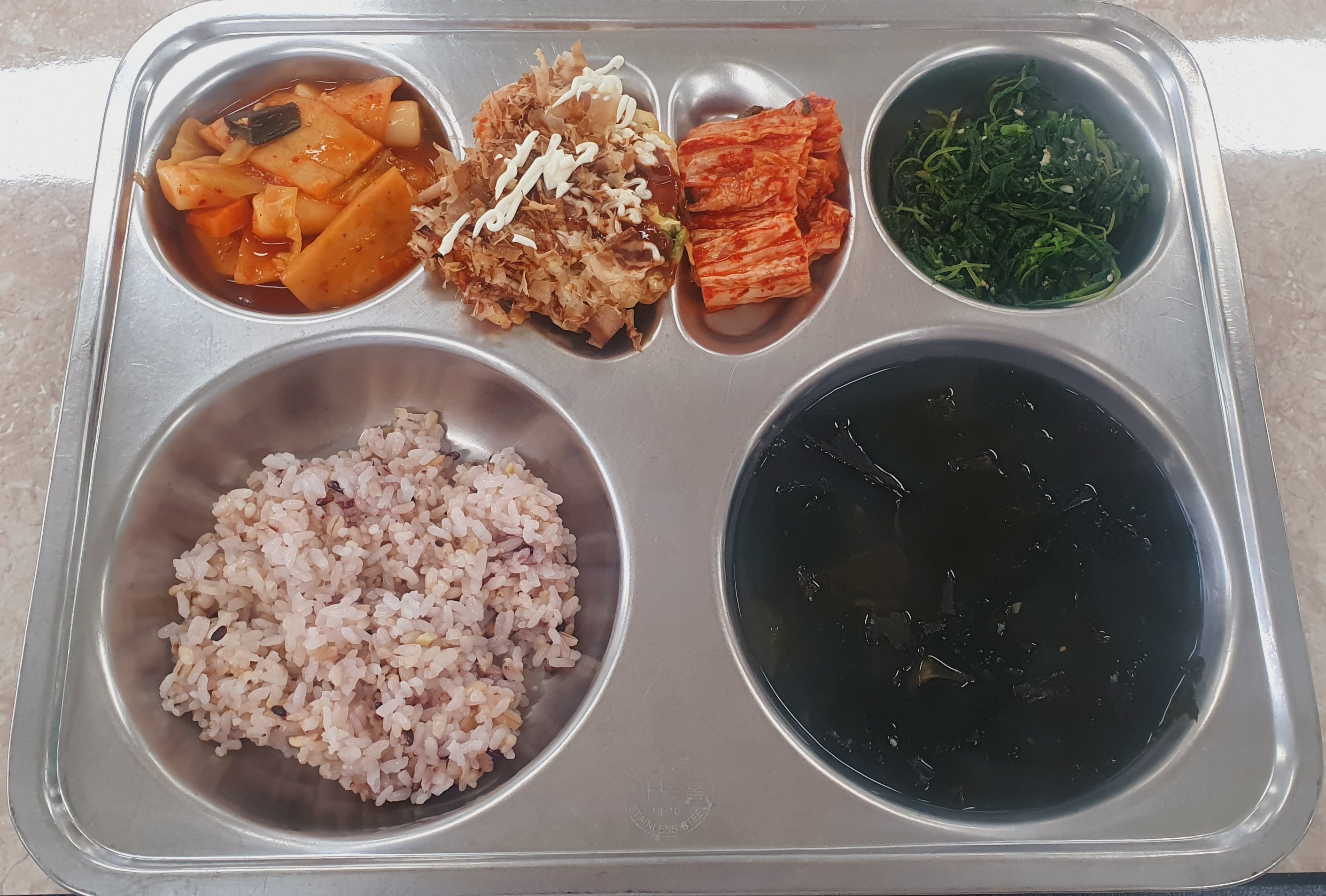 4/14 혼합잡곡밥(5)/대합미역국(5.6.9.18)/오꼬노미야끼(1.5.6.9.12.17)/떡볶이(5.6.12)/비름나물(5)/배추김치(9)