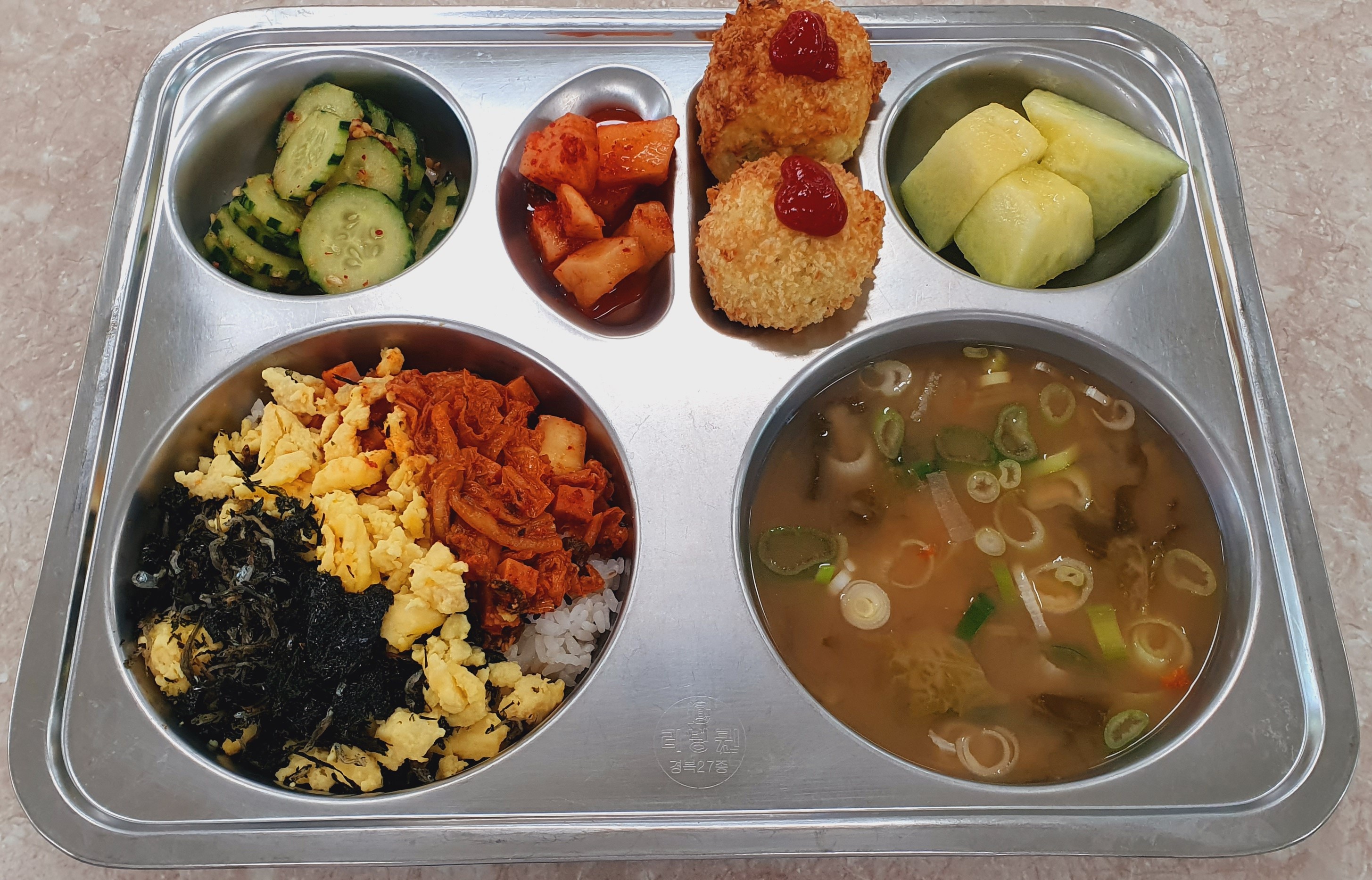 4/15 도시락비빔밥(1.5.9.10)/콩가루배추국(5)/수제감자크로켓(1.2.5.6)/오이양파무침(5)/깍두기(9)/멜론